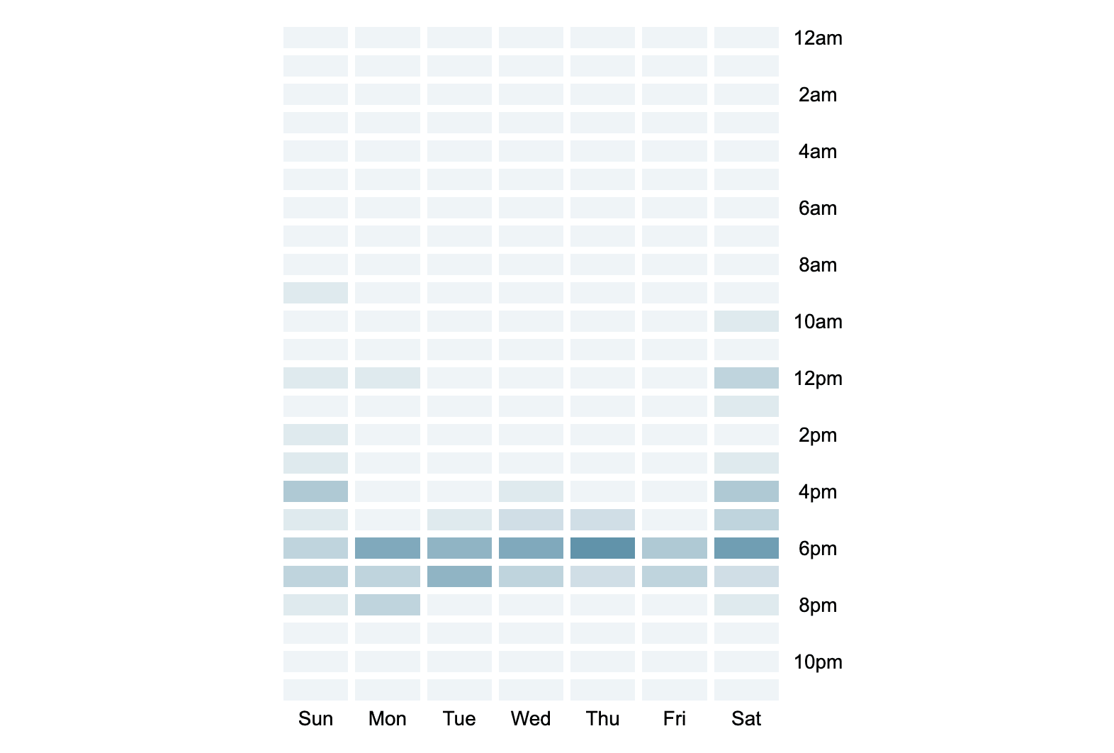 The days of the week will be rendered along one axis, and the other axis represents the hours of that day. Each cell becomes a slightly darker shade the more times it’s repeated in the data set.